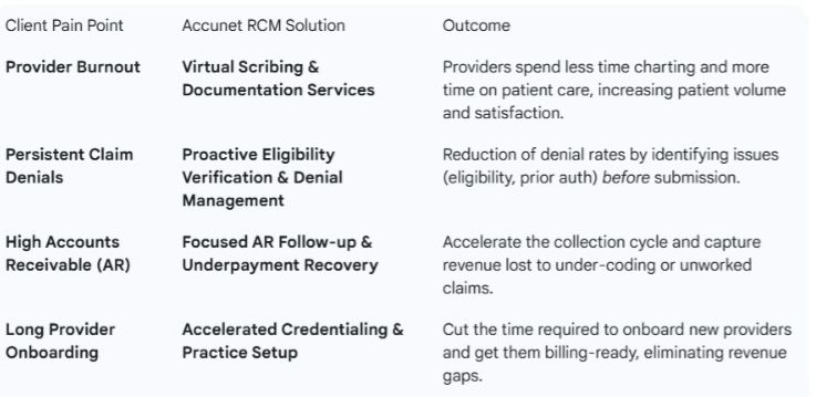 Accunet RCM delivers custom-built strategies designed to solve the toughest operational and financial bottlenecks across various medical specialties and practice sizes.